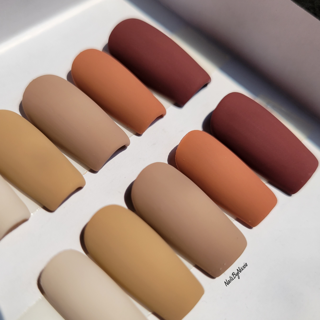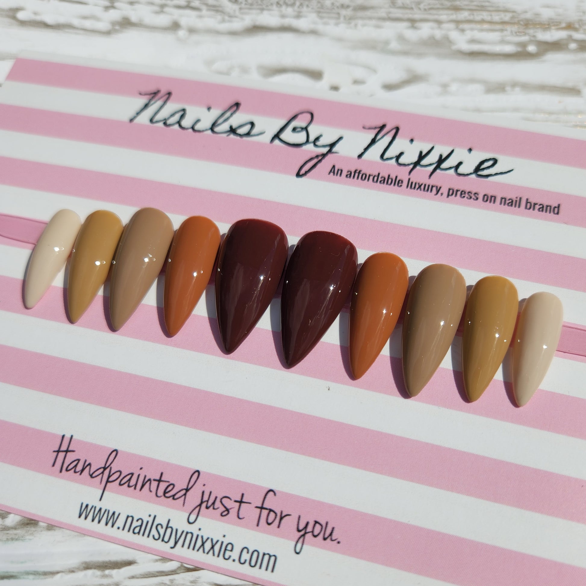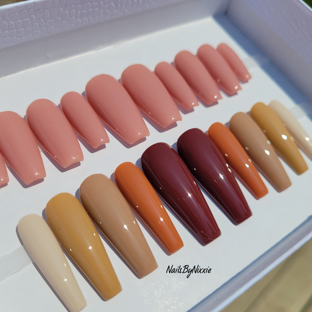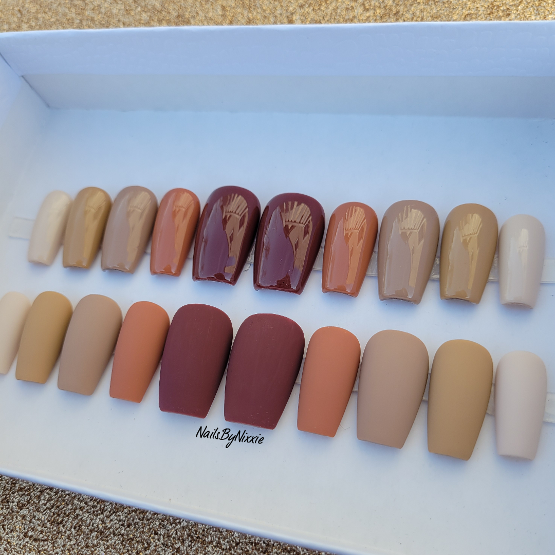 A selection of nudes. Have your nails done with this design in under 10 minutes with our long lasting, gel, press on nails. Choose your favorite length, shape and size and add this made to order nail set to cart!