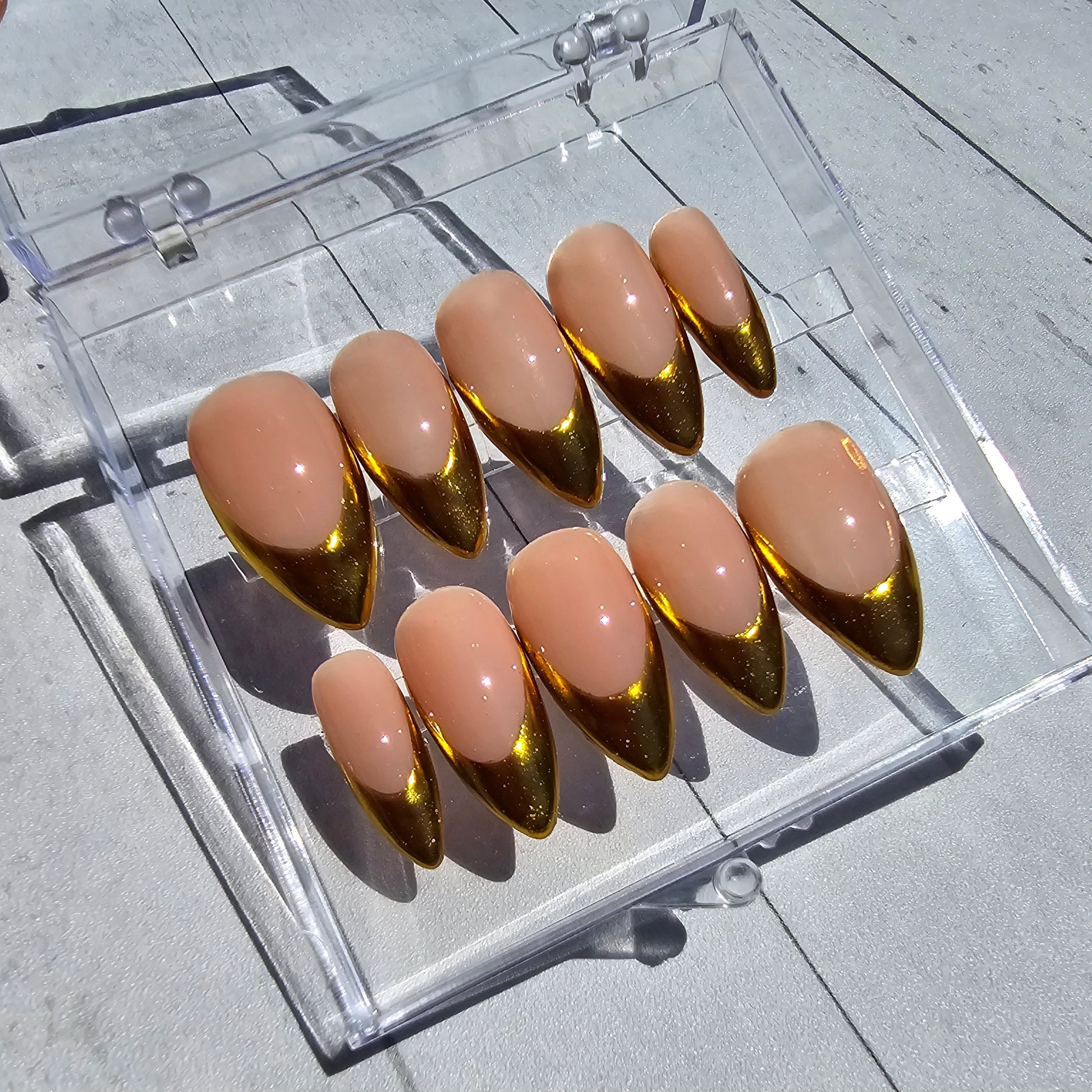 Chrome french tip. Gold chrome will be used unless otherwise specified. Available in a variety of lengths, shapes and sizes with a gloss or matte finish.