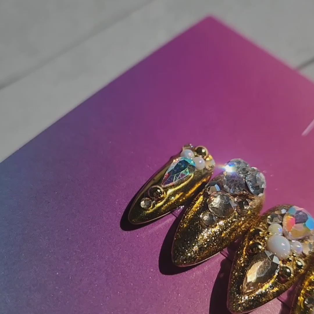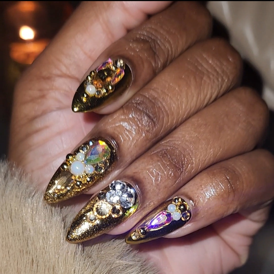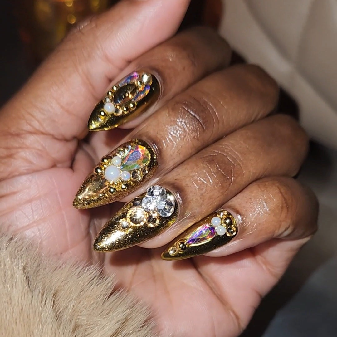 Gold, rhinestone, chrome nail set. Perfect for a special occassion.