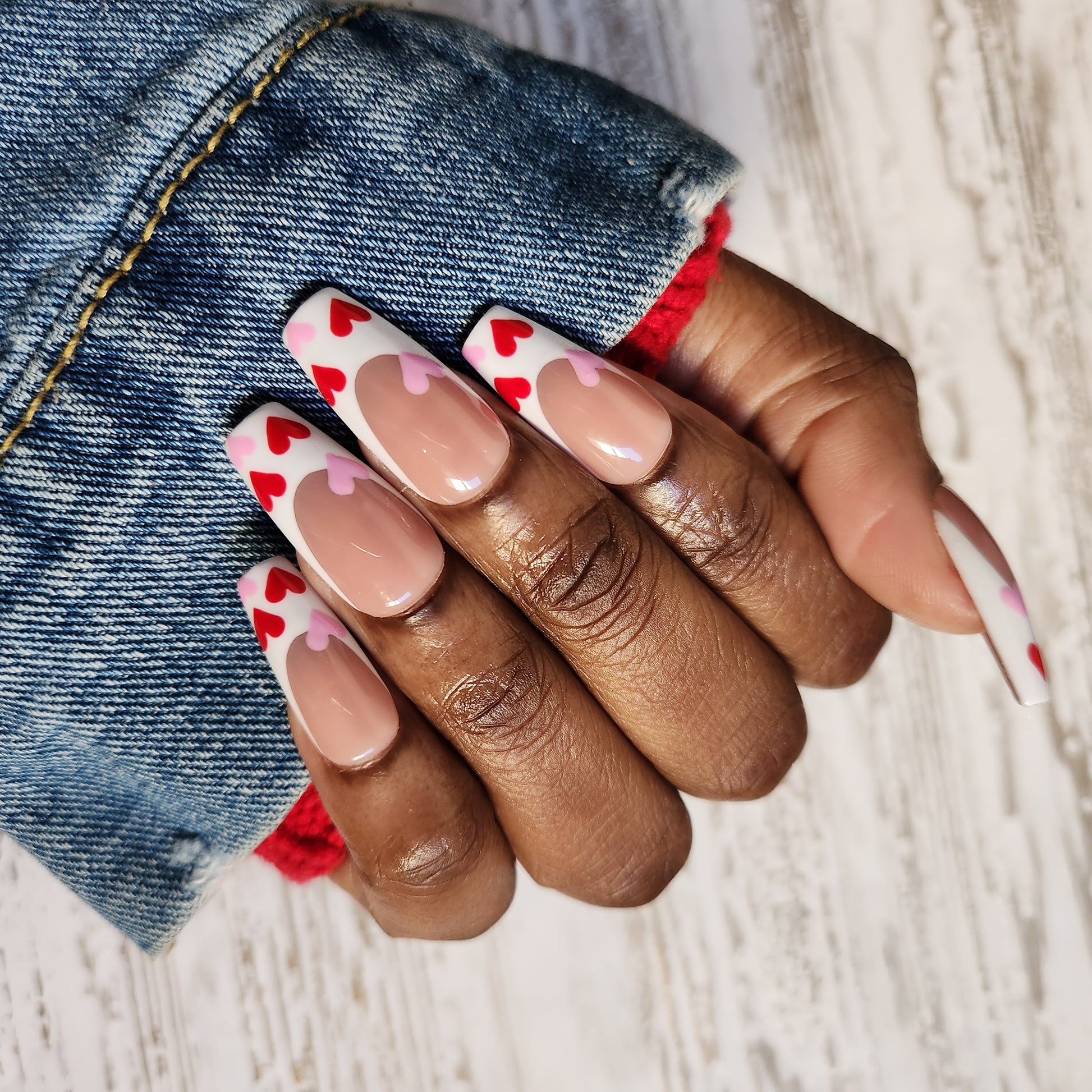 French tip nail design with pink and red hearts. Such a cute valentines day look.