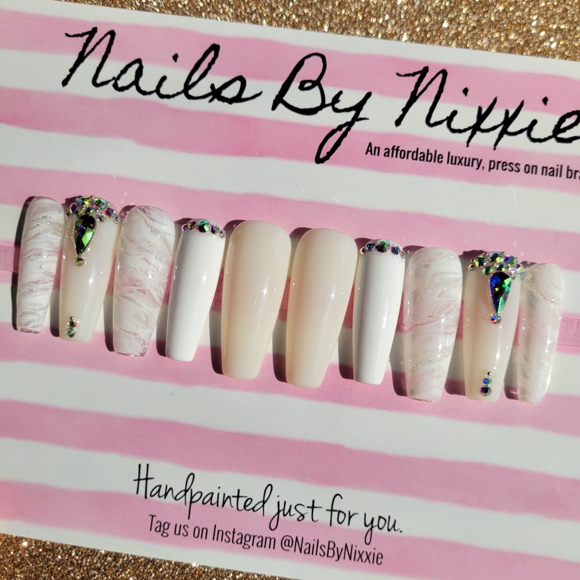 Have your nails done in this design in under 10 minutes with our long lasting, gel, press on nails. Choose your favorite length, shape and size and add this made to order nail set to cart!