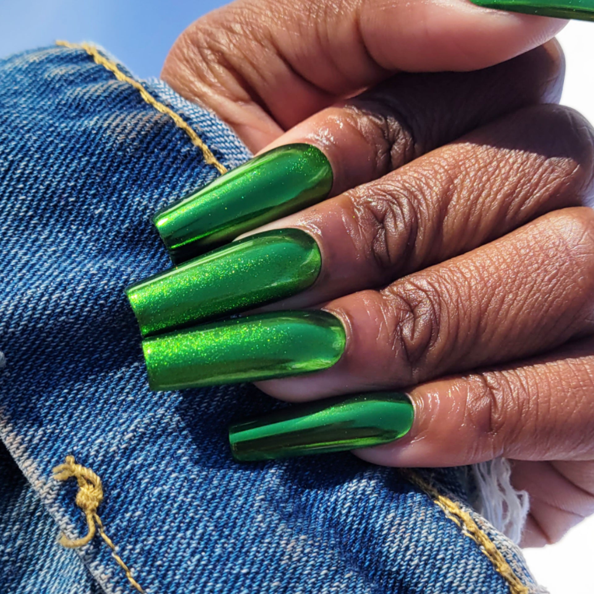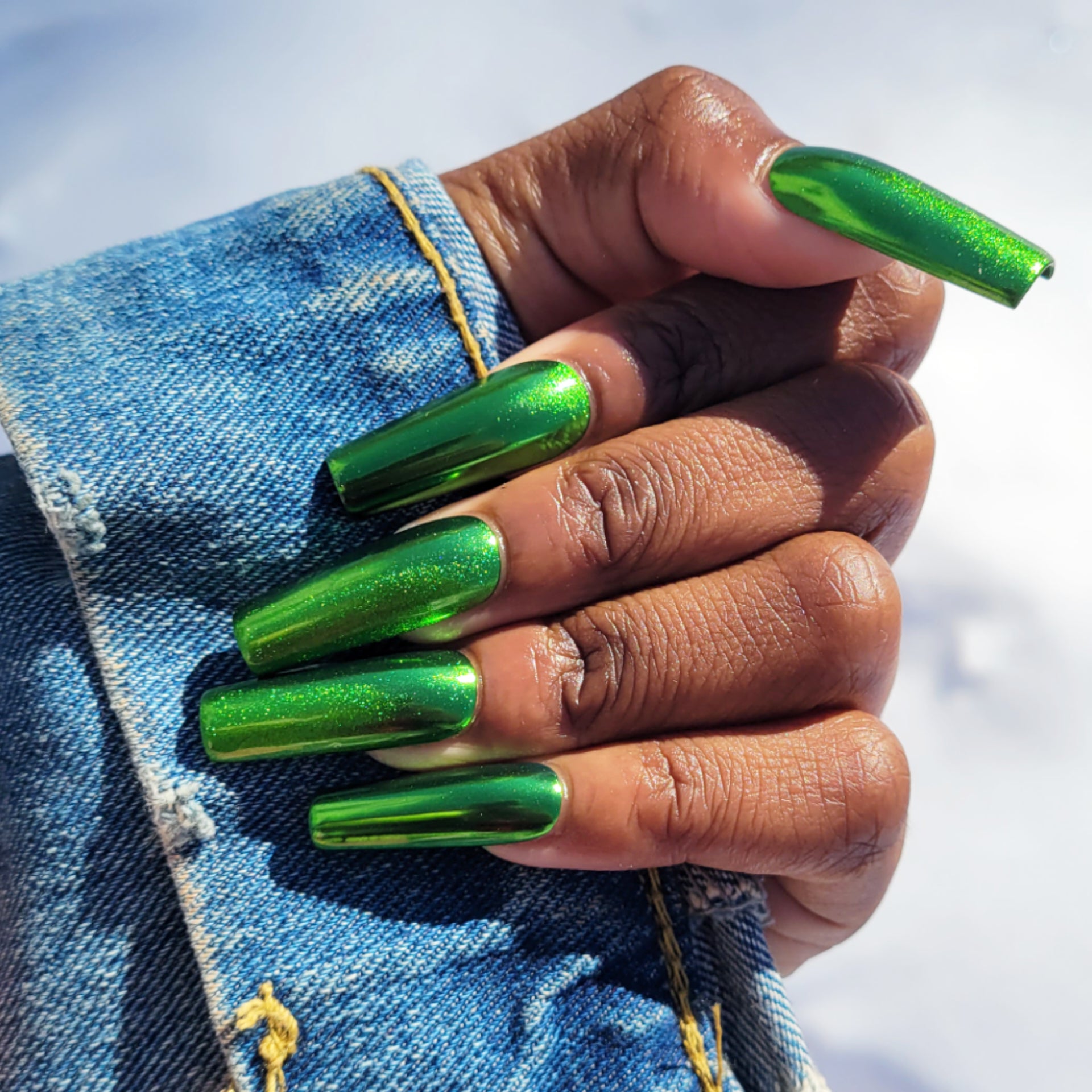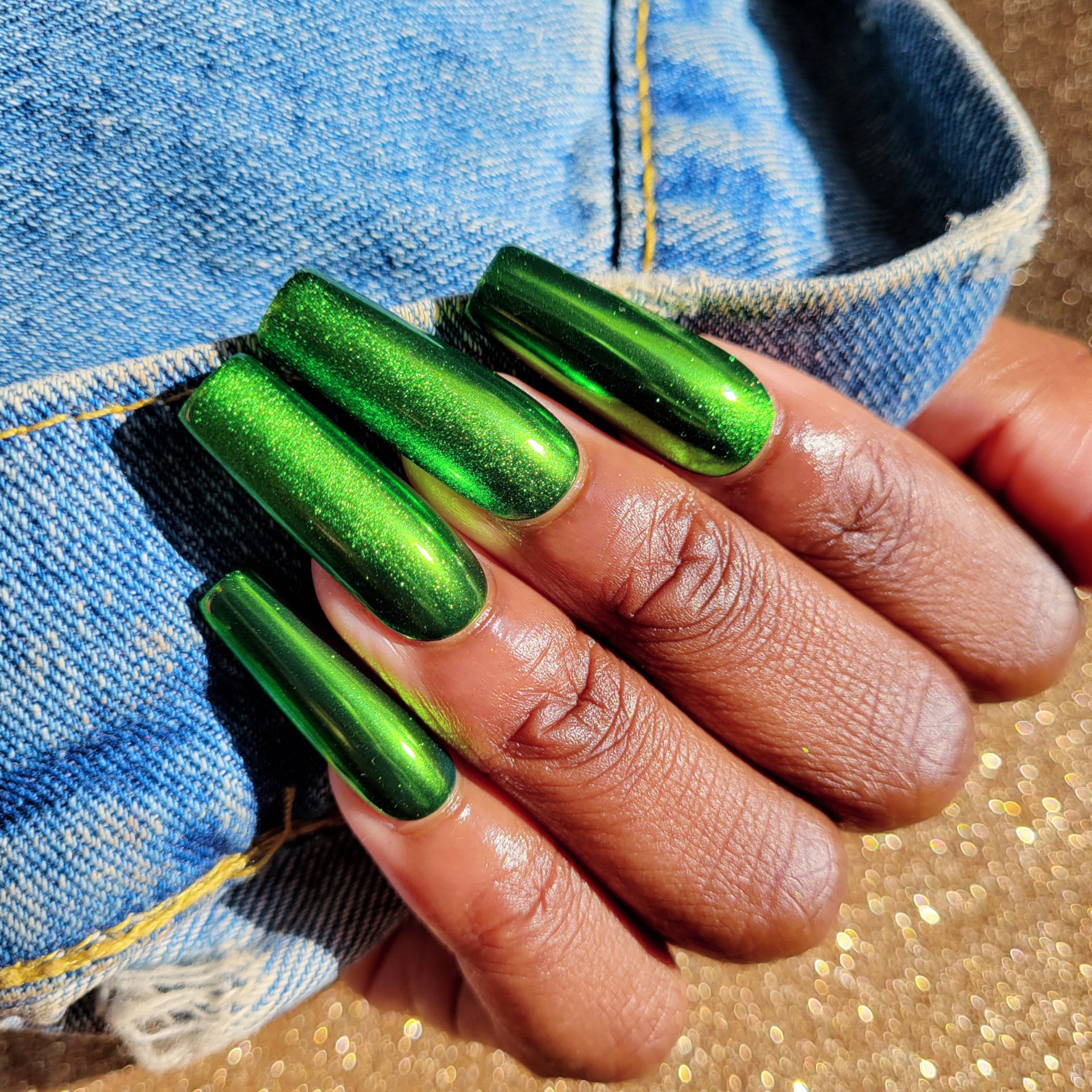 Metallic green nail set. A