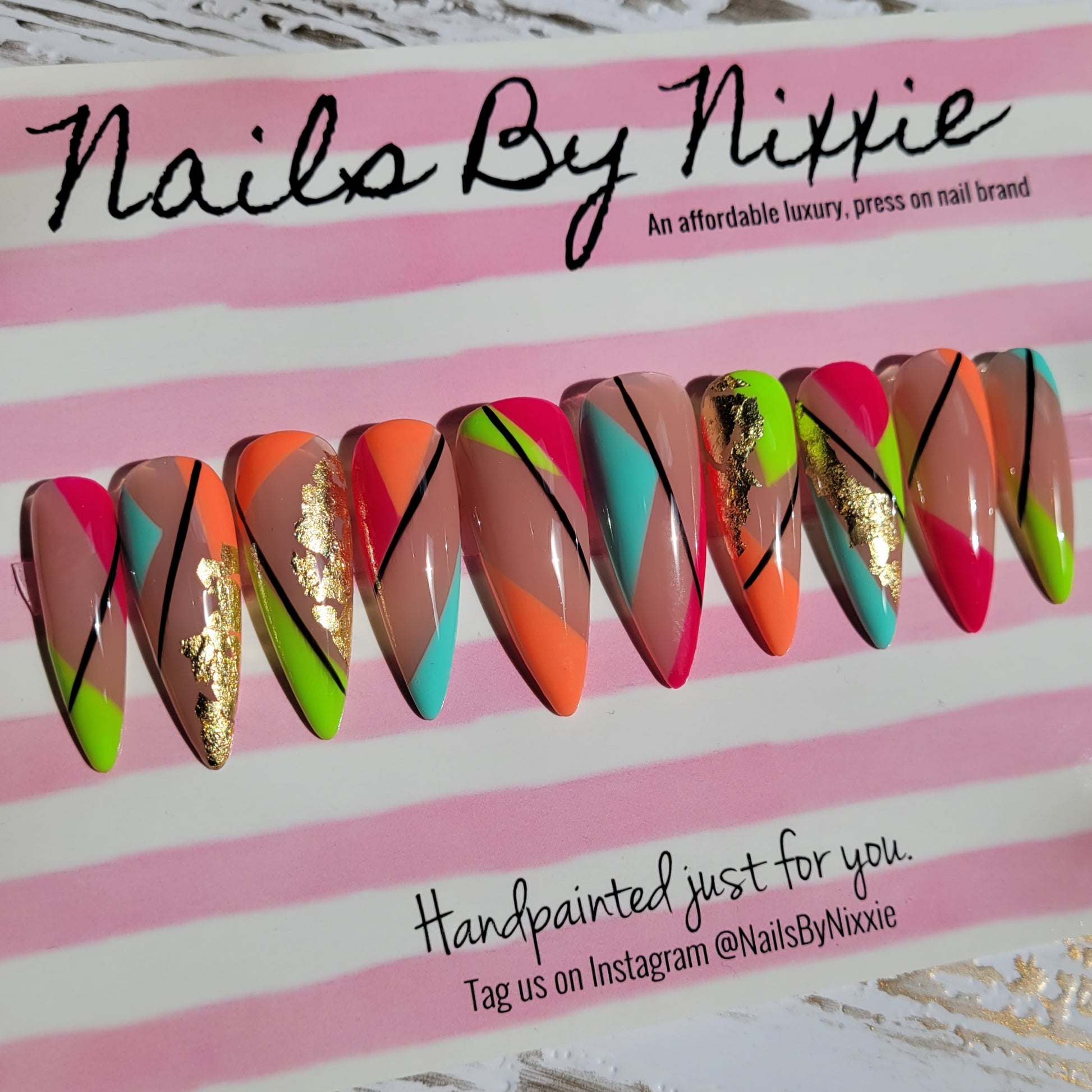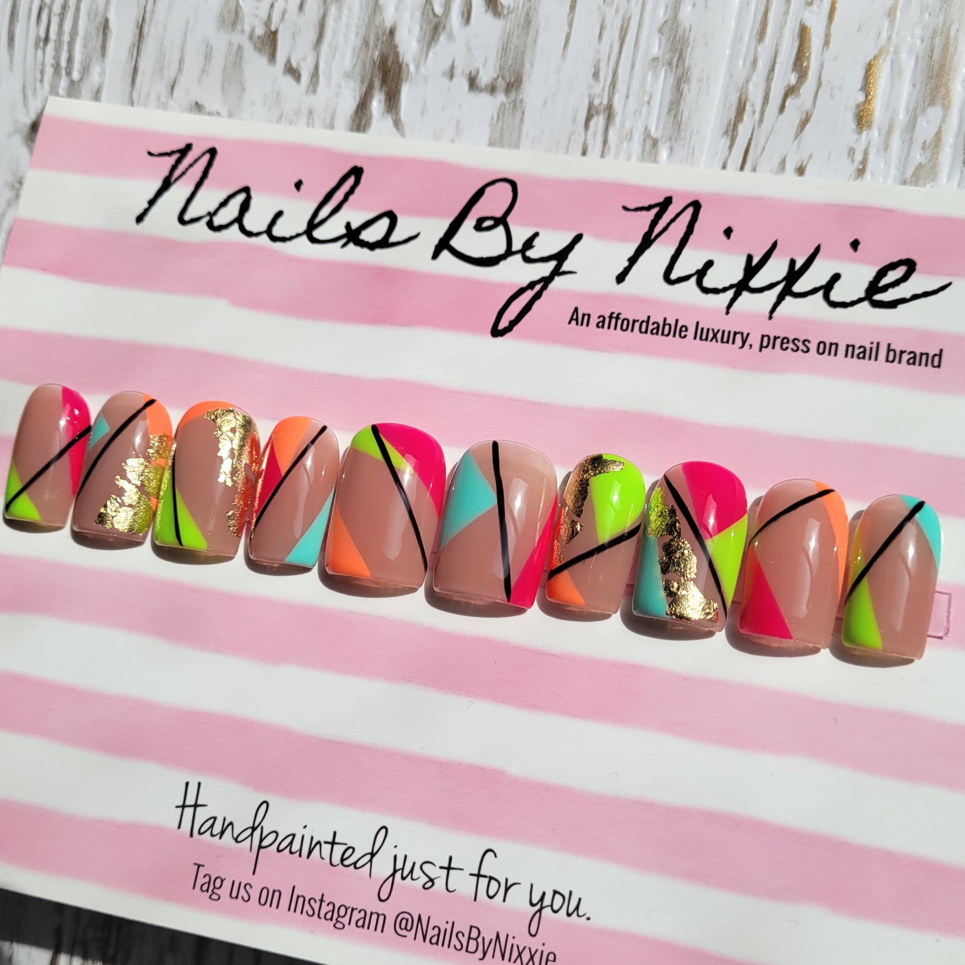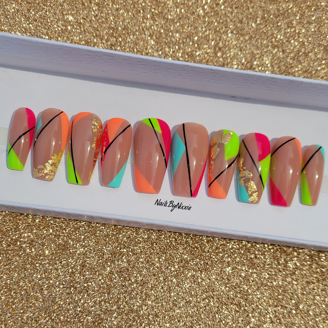 This Neon Abstract nail design is a head turner. With gold flake accents and a nude base.