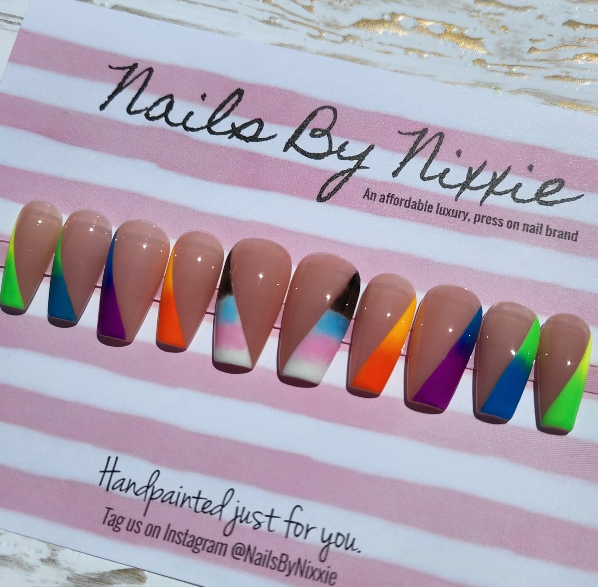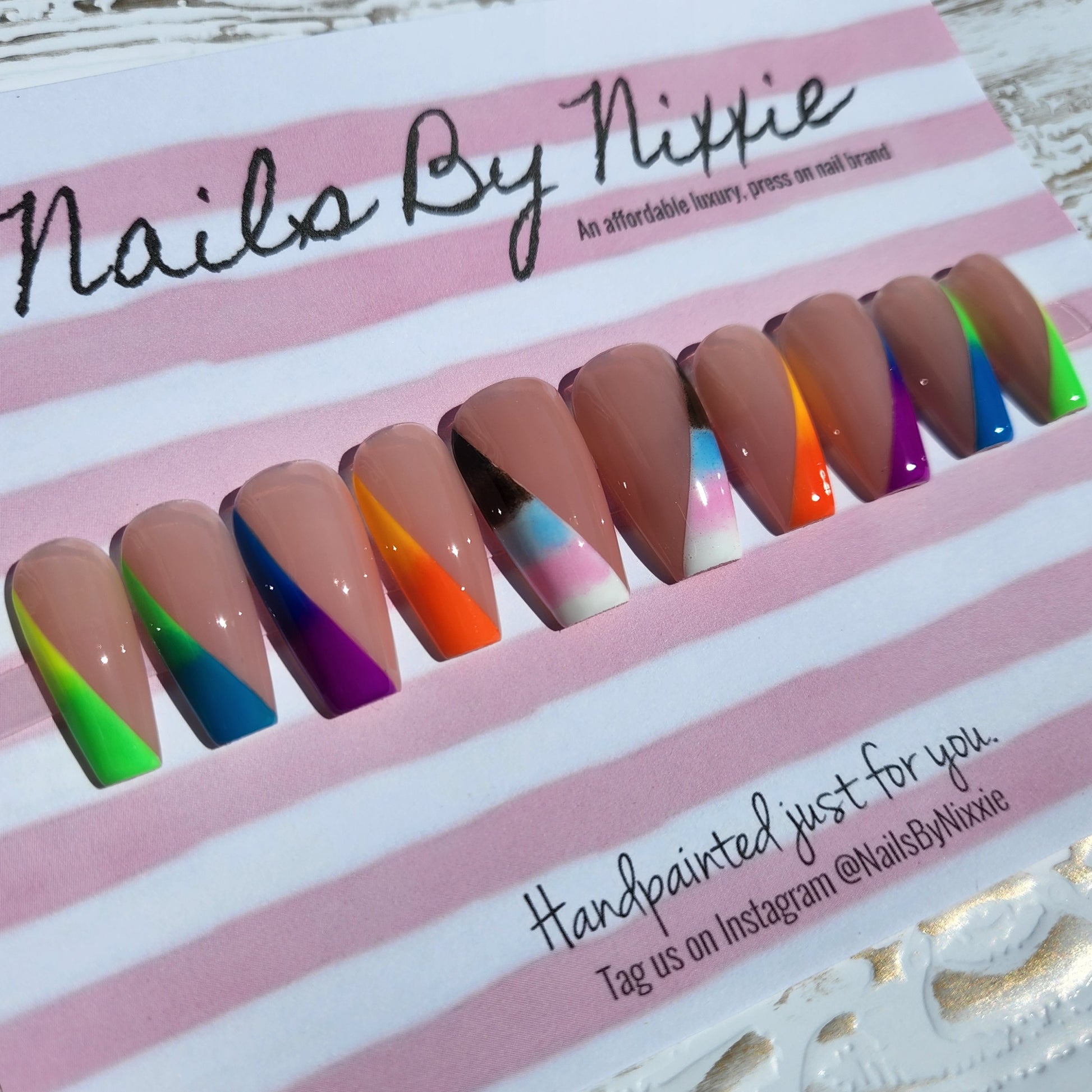 Influenced by the Progress Pride flag, this press on nail set is sure to brighten up your day.
