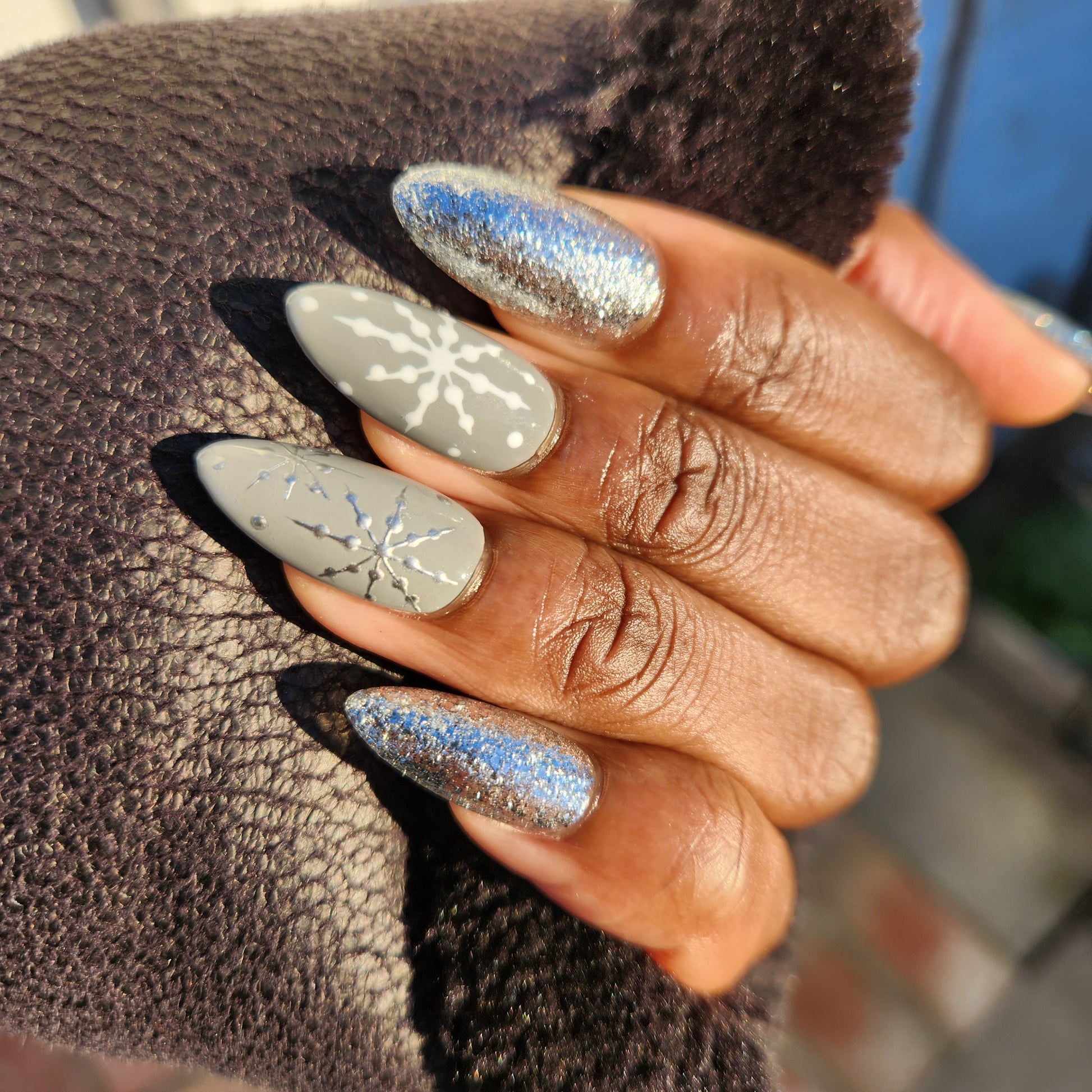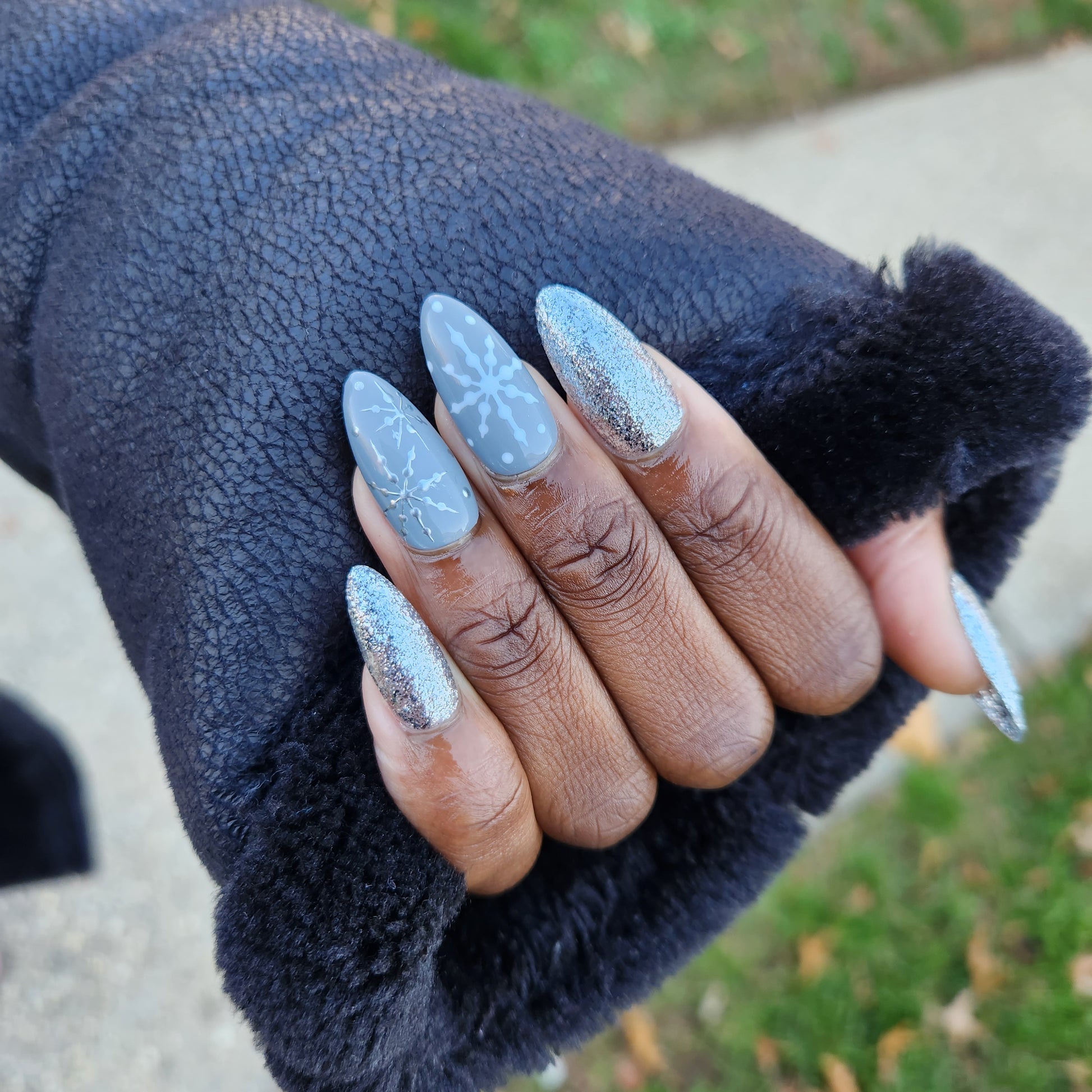 Are you ready for the Holidays? This holiday inspired nail set is sure to bring you some cheer! Silver and grey design with hand drawn snowflake design.