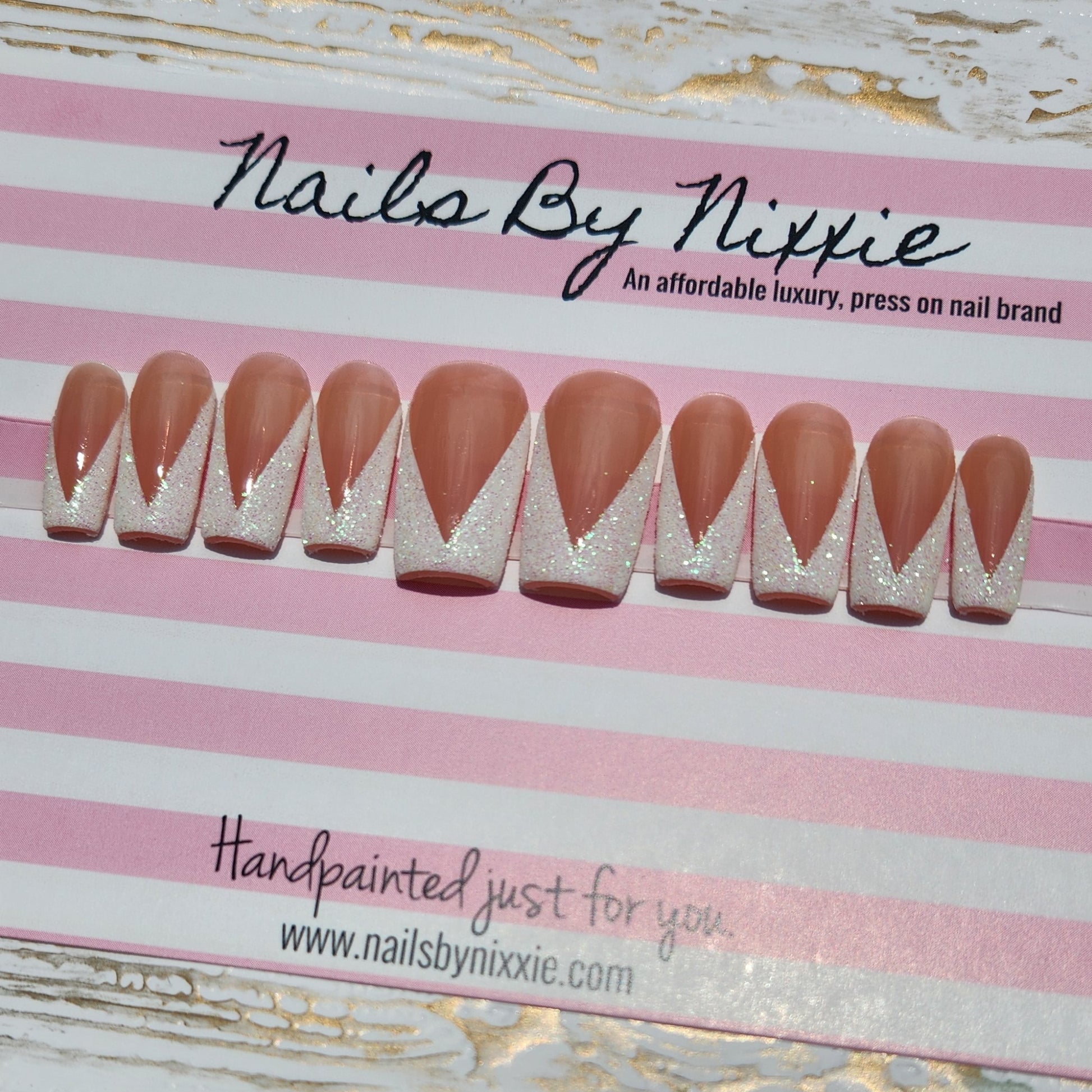This nail set features white vtip nails with a twist. White holographic glitter takes it to the next level. Pictured here in long square and available in a variety of lengths, shapes and sizes.