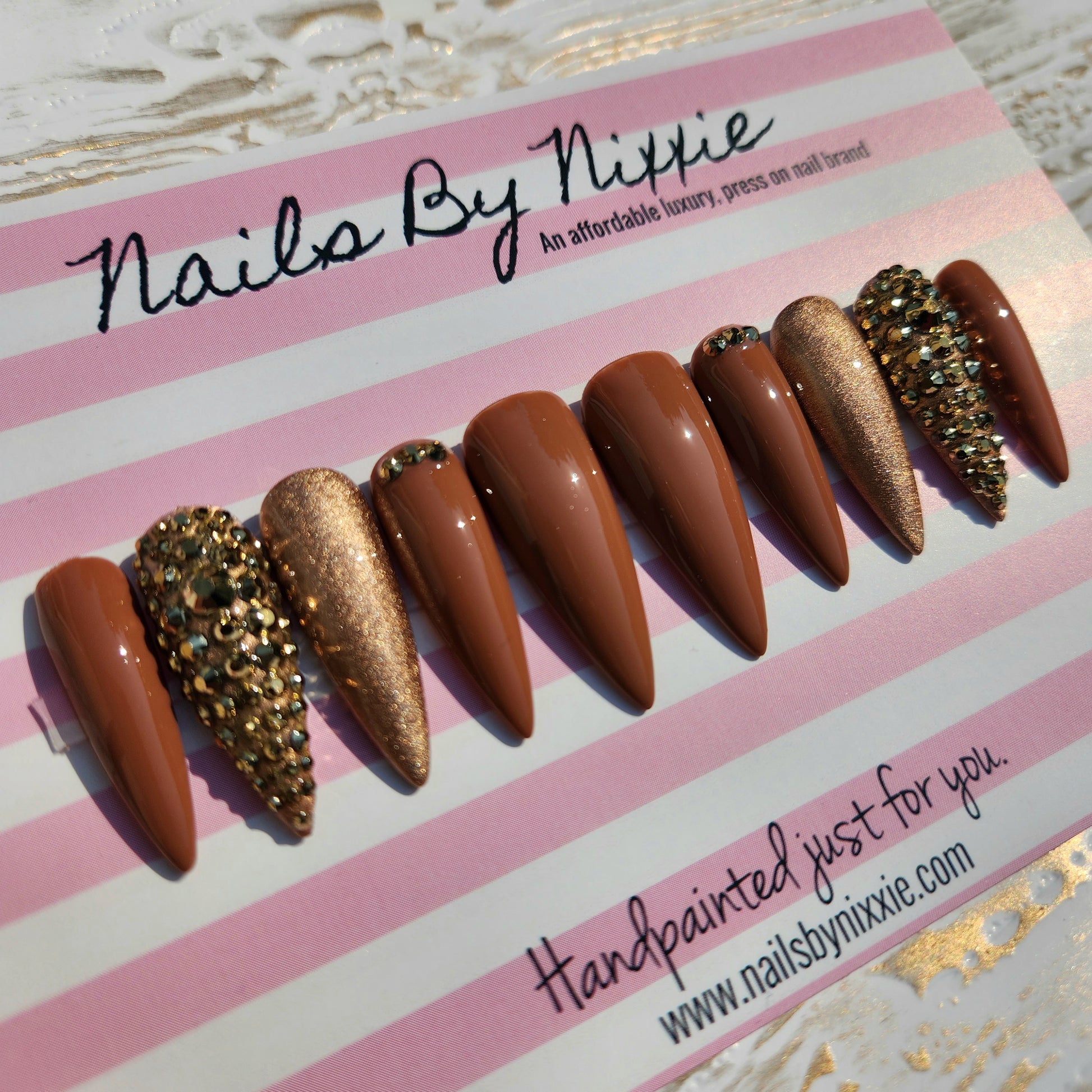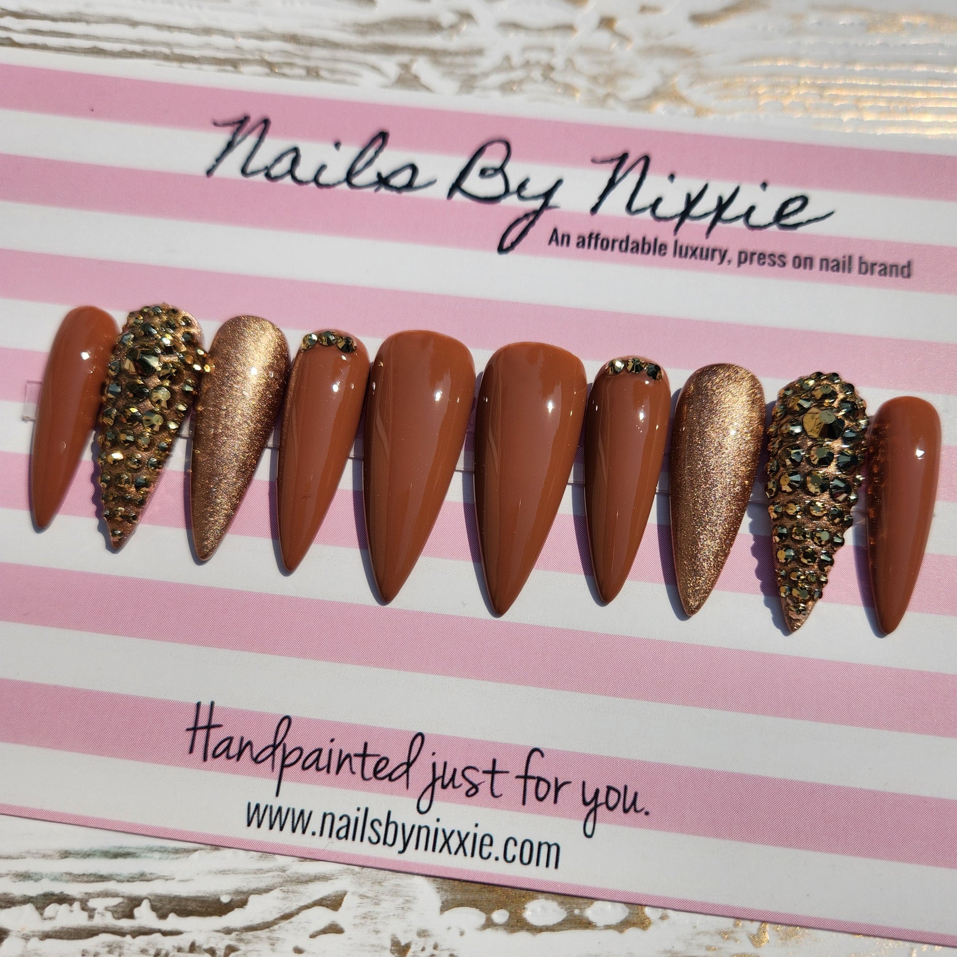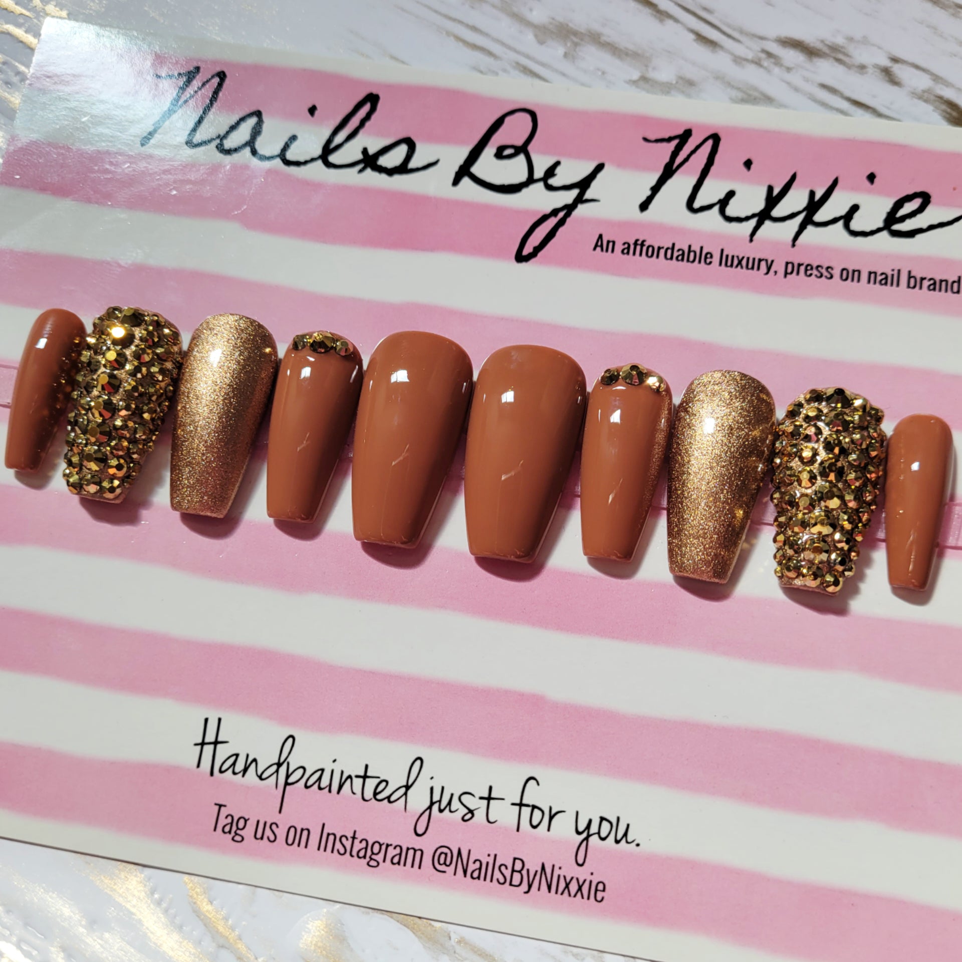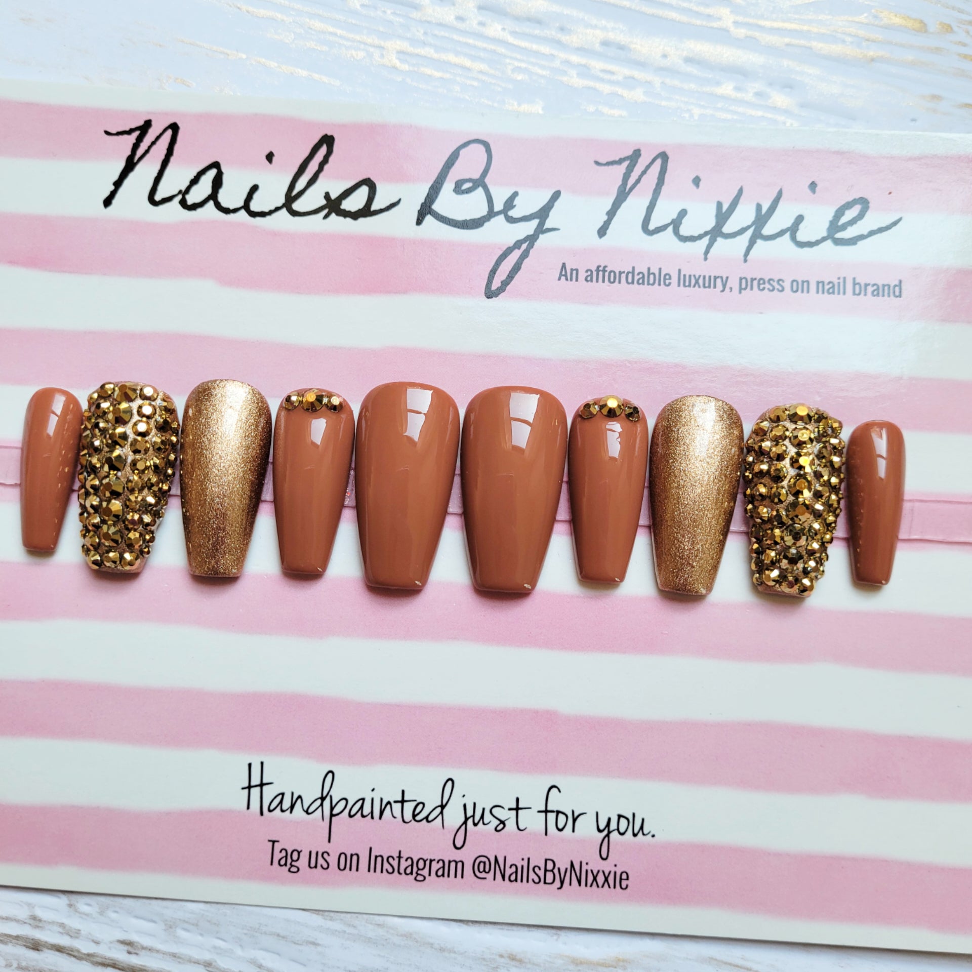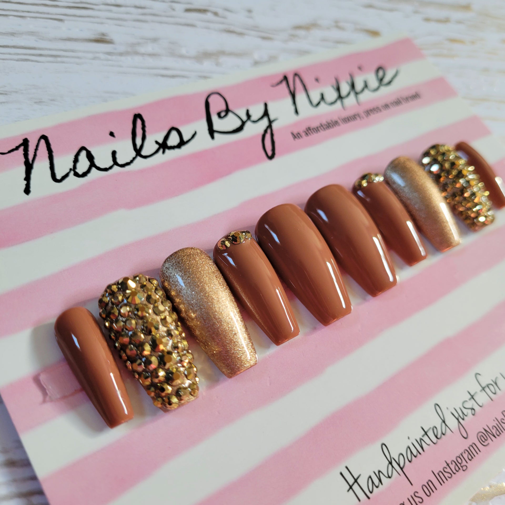 Have your nails done in this design in under 10 minutes with our long lasting, gel, press on nails. Choose your favorite length, shape and size and add this made to order nail set to cart!