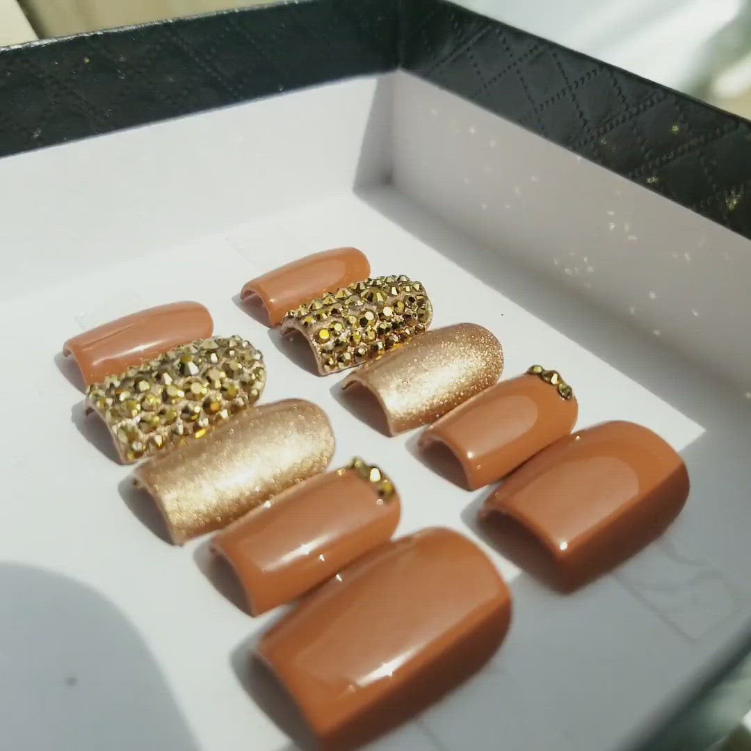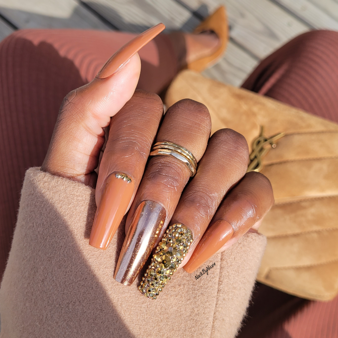 Gorgeous Fall and Thanksgiving inspired nail set with gold rhinestone accent nails and gold chrome accent nails.