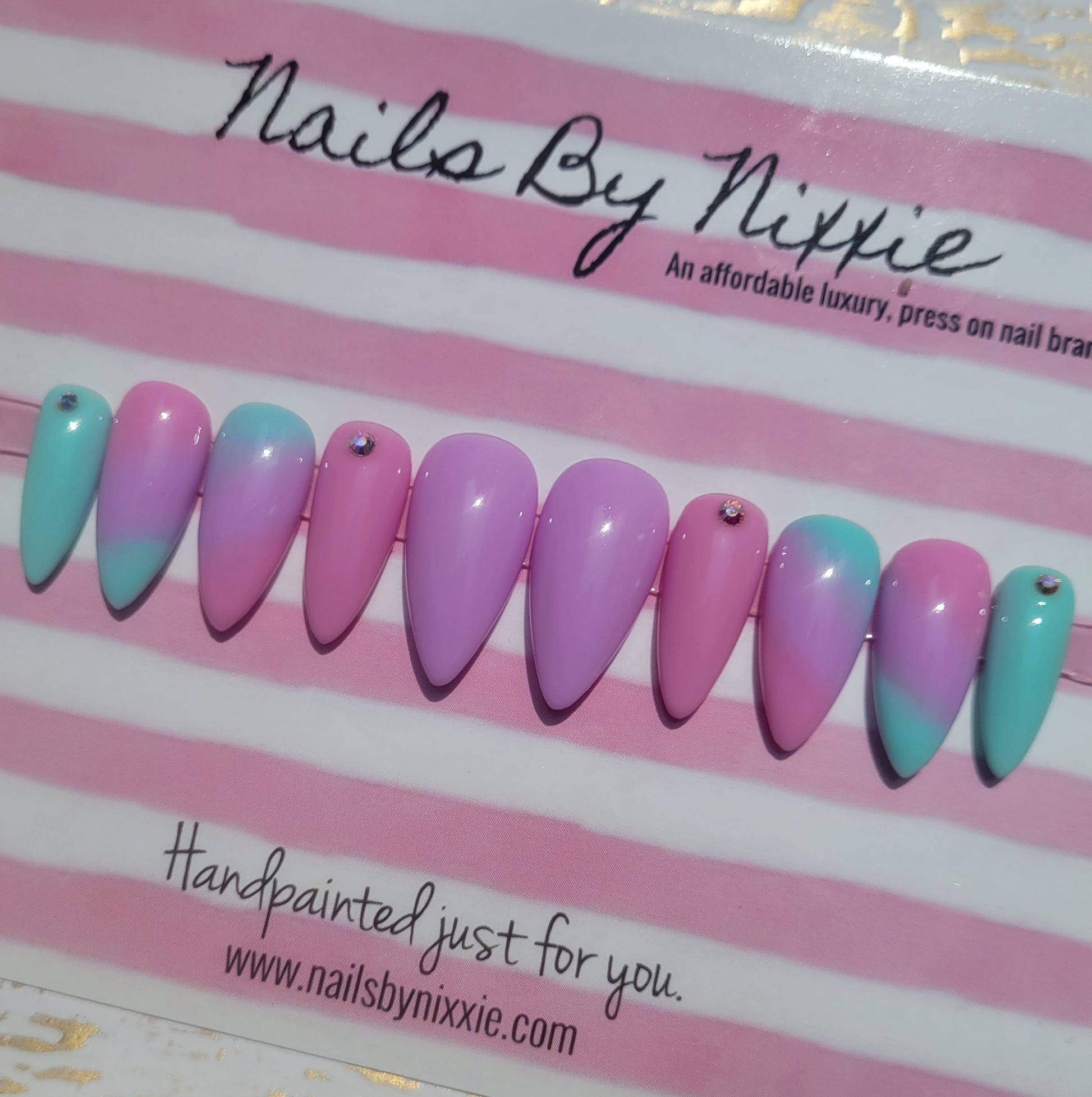 Have your nails done in this design in under 10 minutes with our long lasting, gel, press on nails. Choose your favorite length, shape and size and add this made to order nail set to cart!