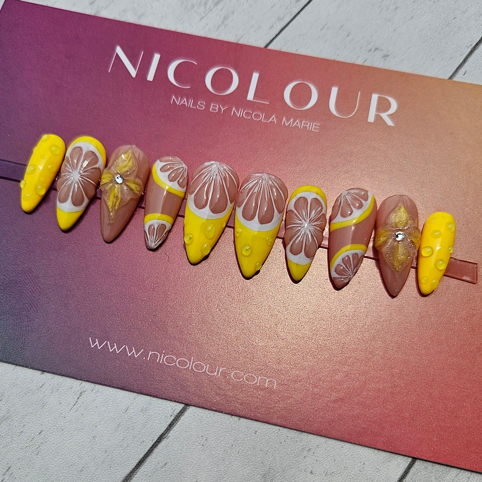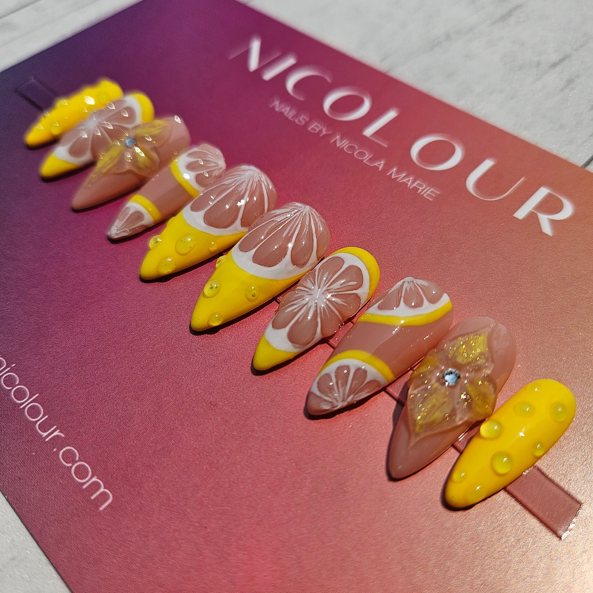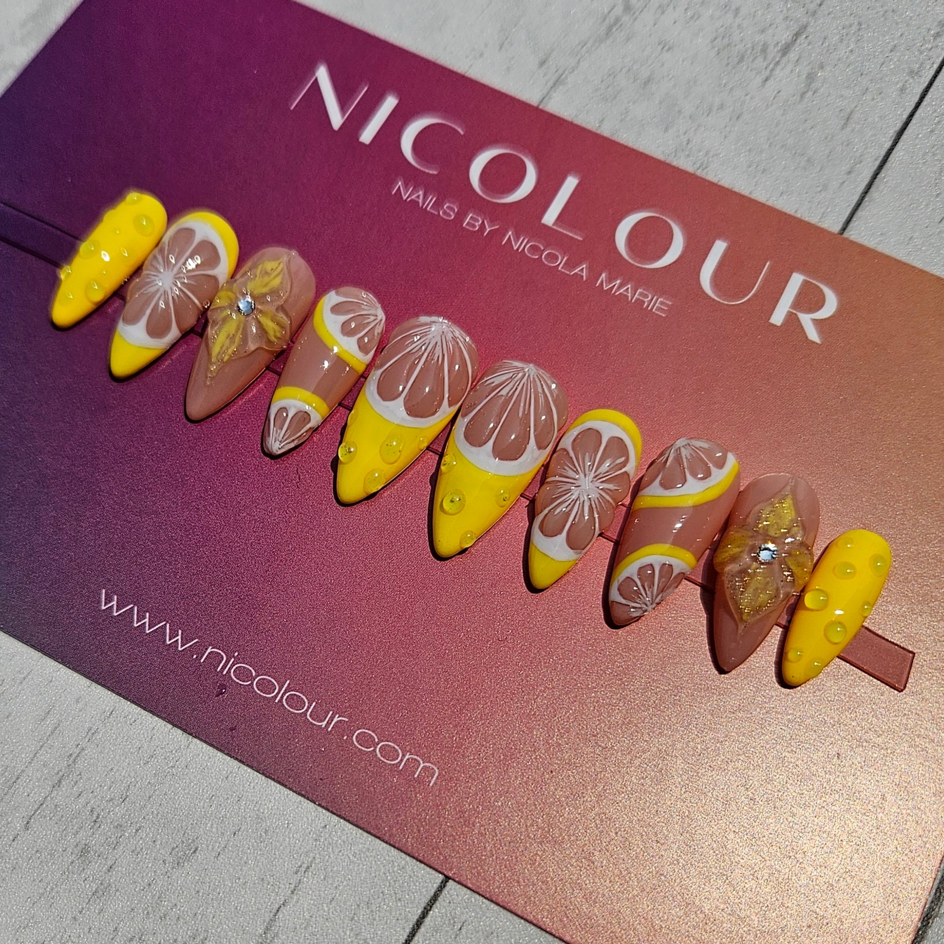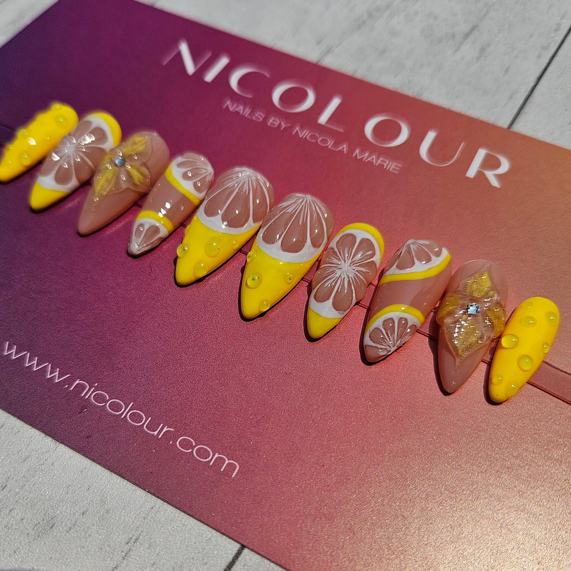 Yellow lemons inspired nail set. Have your nails done in this design in under 10 minutes with our long lasting, gel, press on nails. Choose your favorite length, shape and size and add this made to order nail set to cart!